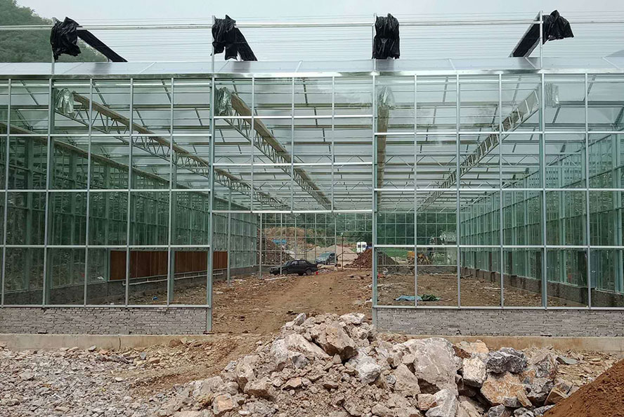 主體結構采用熱鍍鋅管材,覆蓋材料采用陽光板、普通或中空玻璃,采用溫室用鋁合金型材鑲嵌,邊緣與鋁合金型材連接處采用乙丙橡膠條密封。